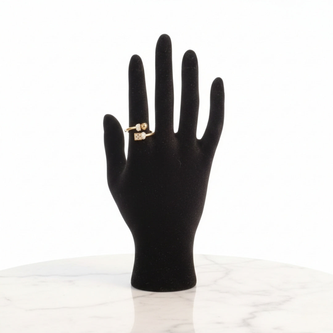 The GL Gold Open-Ended Bypass Zircon Ring features a modern bypass design with an open-ended band for a bold yet elegant look. One end is adorned with a round gold bead surrounded by sparkling zircon stones, while the other showcases a square-shaped zircon accent for balanced contrast.