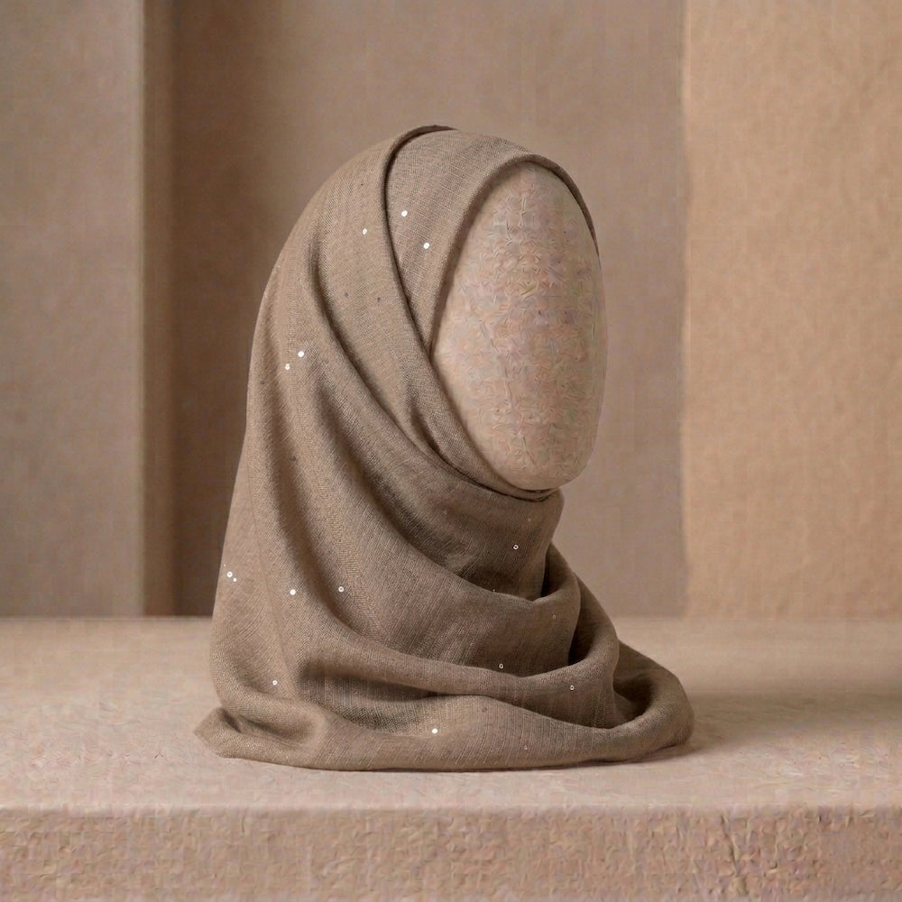 The Light Beige Sequin Lawn Hijab offers soft neutral elegance with a gentle shimmering finish. The breathable lawn fabric ensures comfort while the sequins add a refined glow.