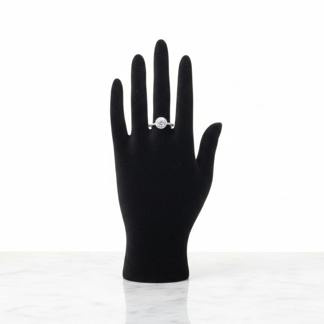 The GL Round Halo Zircon Ring features a brilliant circular zircon center stone, beautifully surrounded by a halo of smaller zircon stones for enhanced sparkle. The pavé-set band adds refined brilliance, creating a timeless yet luxurious look.